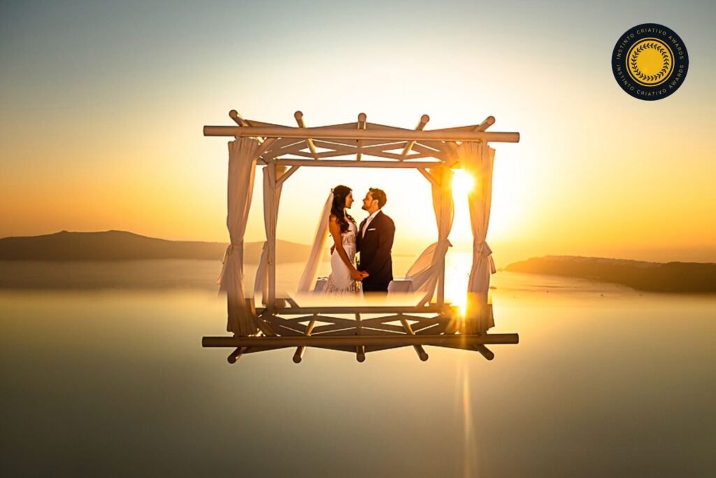 No centro da imagem, um casal se encontra sob uma estrutura delicada, quase etérea, posicionada sobre uma superfície espelhada. O reflexo perfeito cria a sensação de que a cena flutua entre dois mundos: o real e o onírico. Céu e água se confundem, apagando fronteiras e ampliando a atmosfera de encantamento.